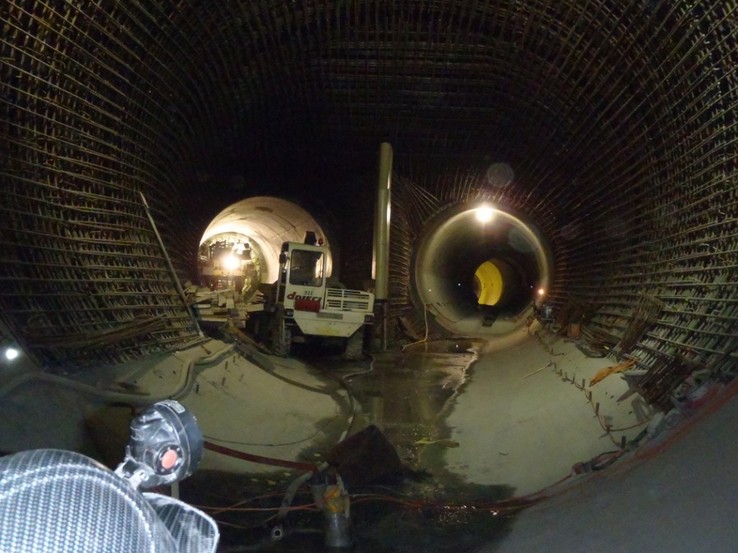 水渠的内壳材质采用的是厚度为0.5米的非钢筋混凝土。为了适应混凝土衬里的相应拉应力(内部应力),混凝土外壳需要一个外力来被动偏差。为此,在喷射混凝土衬里和混凝土外壳之间的环形缝隙中施加了一个喷射压力,考虑到硬化和密封加固,一般会事先在周围的山体上通过孔和单体填料进行喷射注入。