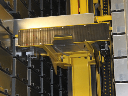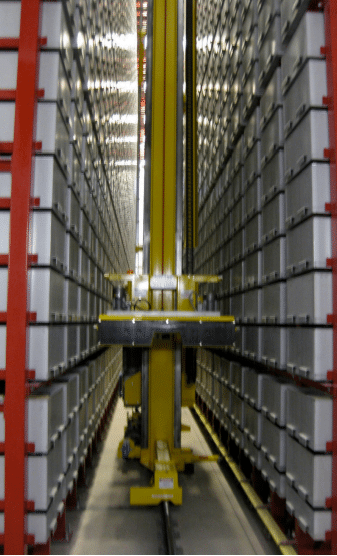 每个梭子都有一个升降托盘的升降机构。为了在多个楼层上存储和取回材料,使用了一种称为垂直起重机的设备。下面的图片显示了一个系统,该系统使用垂直起重机将托盘或托盘提升到适当的货架高度。这种起重机通常在两个轴上移动。一个轴是高度,另一个轴是沿着地板上的轨道定位。