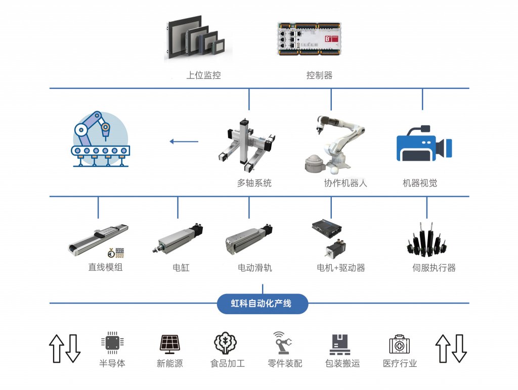 宏集自动化产线解决方案 宏集科技提供直线电机、直线模组、电动缸、PLC、HMI、触控一体机、线性执行器等工业自动化产品组合,帮助您搭建从上位监控到下位执行的完整自动化产线。 联系宏集 解决方案架构图 在少人工干预的情况下,精准高效执行对多尺寸物料的装配、抓取等一系列自动化操作。 应用领域 广泛适用于半导体、新能源、食品加工、包装搬运、零件装配、医疗等行业。 半导体 新能源 食品加工 包装搬运 零件装配 医疗 相关产品 包括直线电机、直线模组、电动缸、PLC、HMI、触控一体机、线性执行器等 HMI面板 控制器 传动机构 执行设备
