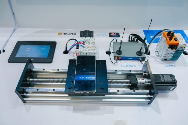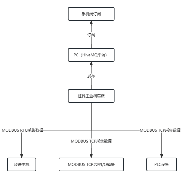宏集工业树莓派通过MODBUS协议分别采集步进电机、MODBUS TCP I/O模块、PLC设备数据,并在工业树莓派完成一些简单的数据处理。宏集HiveMQ将PC端配置为MQTT Broker;工业树莓派可通过MQTT协议将数据传输到PC端;在手机端,操作人员可通过自行编写的APP程序订阅PC端的数据主题。
