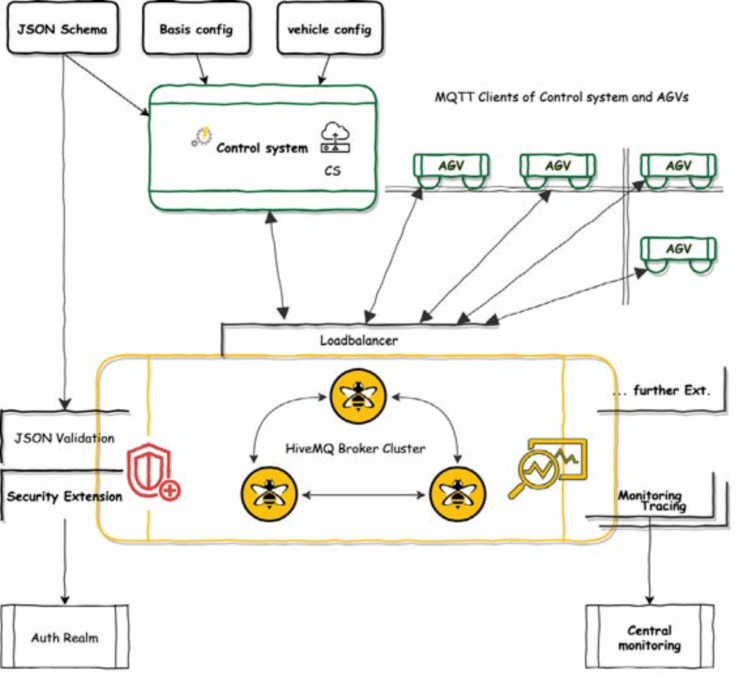 为了集成其他系统,例如中央日志系统或添加任何业务功能,可以通过扩展系统来扩展 HiveMQ,而且大量的开源解决方案和标准解决方案已经可用。在Open HiveMQ扩展API的帮助下,每个特定业务的解决方案都可以实现。将HiveMQ和MQTT 5结合起来实现VDA 5050用例将是一个完美的解决方案。