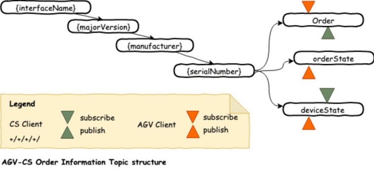 每个AGV小车订阅他们各自的指令主题,并发布信息到对应的指令状态主题,当AGV小车客户端消费指令信息并处理指令或部分指令后,必须将相应的指令状态发布到orderState主题上。同时,控制系统可以订阅所有AGV小车指令状态和设备状态主题以此获取AGV小车的相关信息。
