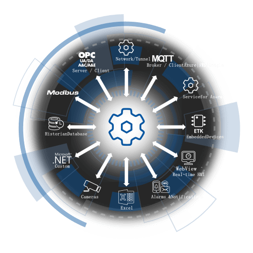 其他功能包括DDE/Excel 支持,用于连接 Excel 电子表格和其他 DDE 服务器;电子邮件/短信通知,用于根据数据变化接收电子邮件或短信;内部历史数据库,用于高速存储和检索大量数据;数据冗余,用于在相同数据源之间进行热待机切换;以及摄像头,用于传输系统的实时视频或图像。
