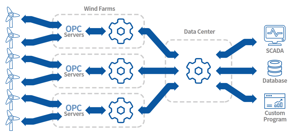“我们面临的挑战是从多个不同数据源采集数据,每个系统都有独特的软件接口,”项目负责人解释道,“风电行业尚未有广泛认可的标准化数据聚合方法。宏集DataHub 的数据分流功能使我们能够有效连接这些分散的 SCADA 系统,并确保实时数据获取。在某些情况下,宏集DataHub软件直接安装在OPC服务器上,而在另一些情况下,它则安装在同一局域网内具有访问权限的另一系统中。无论哪种情况,均不影响设备性能。”
