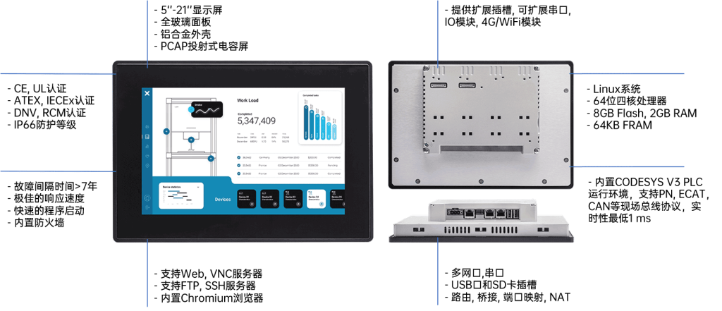 (4)集成CODESYS V3运行环境,可作为软PLC使用,支持Profinet、EtherCAT、Ethernet/IP等多种现场总线协议;