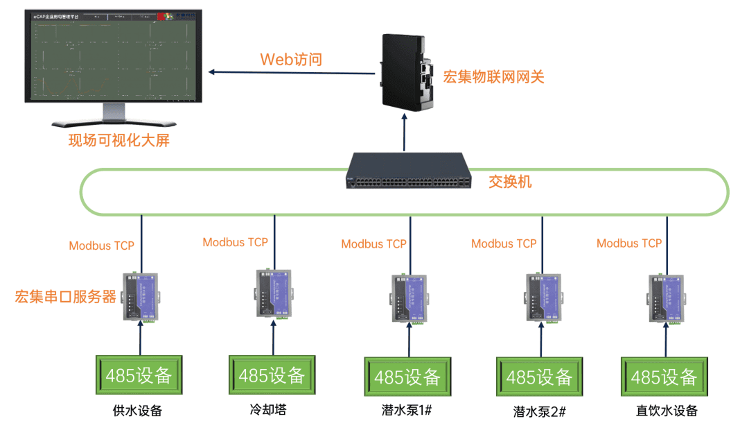 北京某水务设备公司需要为水循环管理系统提供数据采集与监控方案。该系统包括5个关键设备:供水设备、冷却塔、2个潜水泵、直饮水设备。现场的设备通过485接口连接,经过网关设备转换成以太网传输数据,整个传输距离大约为30米。