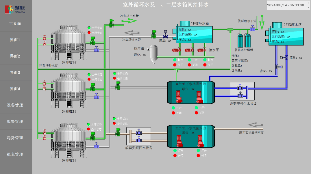 HMI界面设计需要简洁且直观,以便用户快速获取水流量、泵站、阀门等设备的运行状态,进行高效的操作和控制。复杂的UI设计可能导致操作复杂且容易出错。
