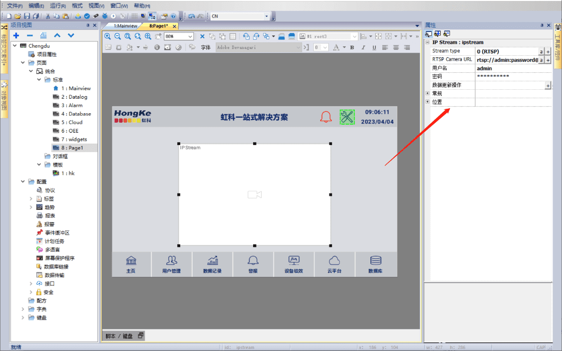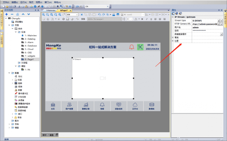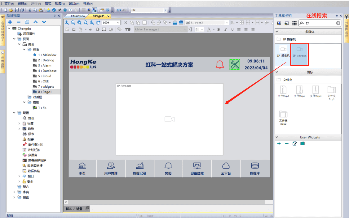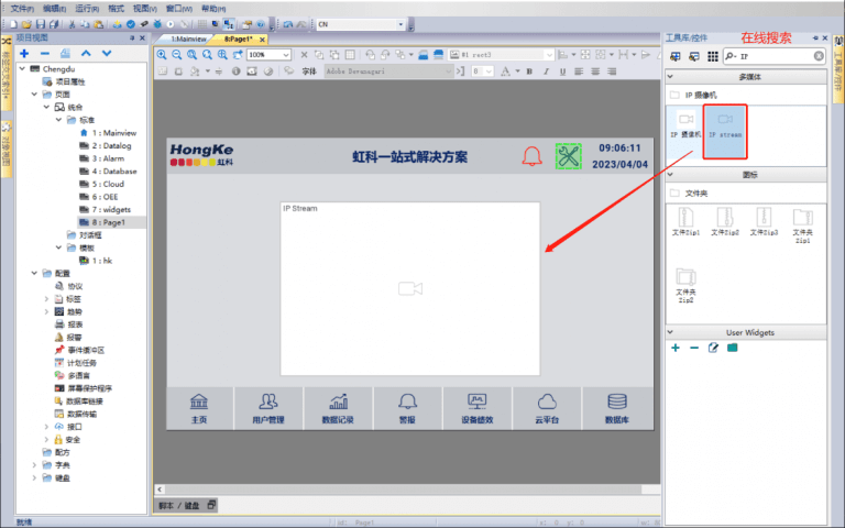(1)打开JMobile Studio组态软件,在控件库中搜索IP Stream控件,并拖拽到页面中,用户可以根据需求调整控件大小。