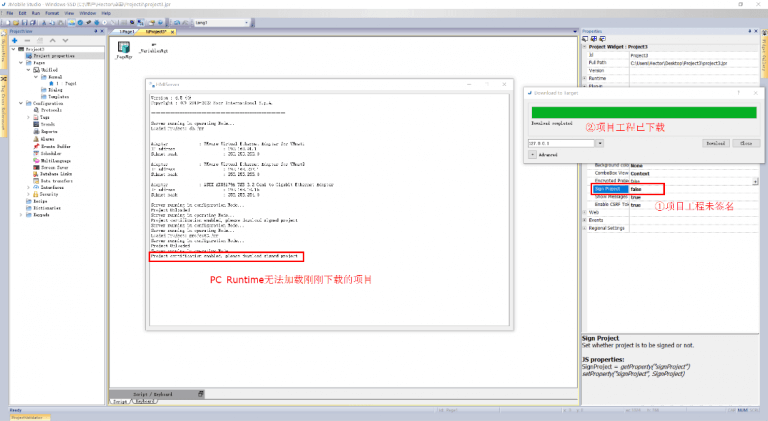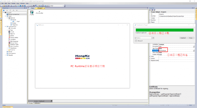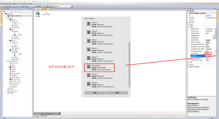 分别在用户PC、HMI设备(或JMobile PC Runtime)安装完证书后,需要在组态软件JMobile Studio完成项目签名的参数配置,具体操作如下。