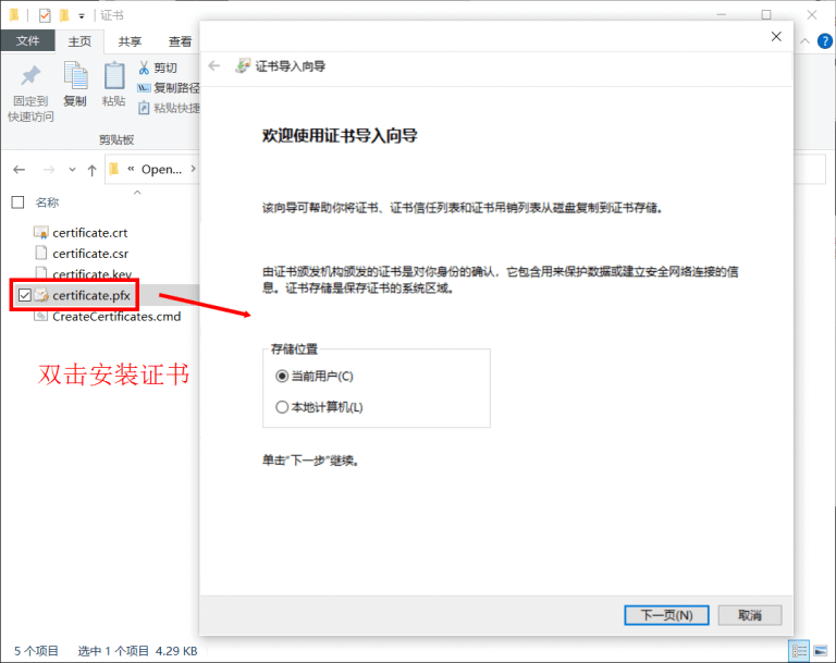 用户PC只有安装certificate.pfx证书才可以对项目进行签名,双击certificate.pfx证书,根据提示完成证书安装。