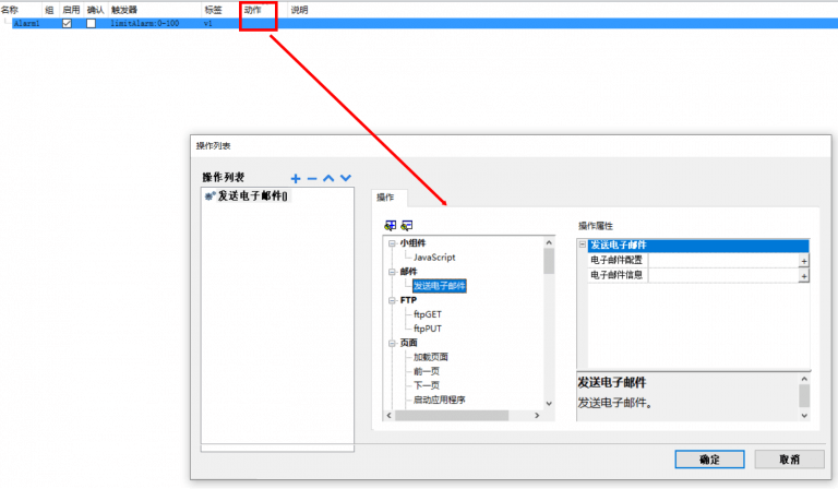 基于现场设备故障的判断条件,通过配套组态软件JMobile Studio为虹科物联网HMI添加并配置设备故障警报,同时添加“发送电子邮件”警报触发动作,通知企业相关人员。