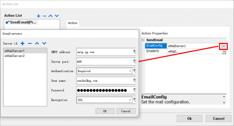 (2)配置SMTP服务器参数(QQ邮箱为例)。