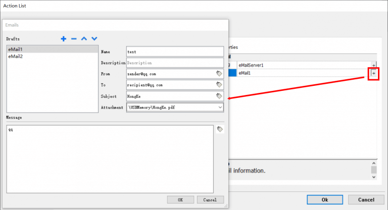 可以在“Attachment”选项中添加附件文件,将虹科物联网HMI本地内存、U盘或SD卡中存储的历史数据、警报事件、日志、报表等文件一起发送给相关人员。实际效果图如下。