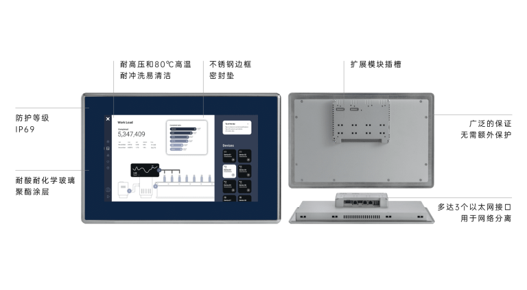 宏集EXOR物联网HMI的平均无故障间隔时间(MTBF)长达7.1年,为设备长期稳定运行提供坚实保障,减少了生产停机时间和维护成本。部分型号符合DIN EN1672-2、EHEDG和FDA 21 CFR 177.2006的卫生设计标准,具备IP69的防护等级,能够承受高压清洗和高温消毒,适用于严苛的食品加工和包装环境
