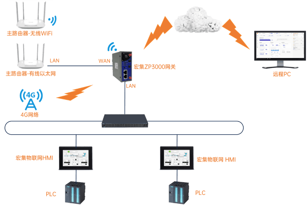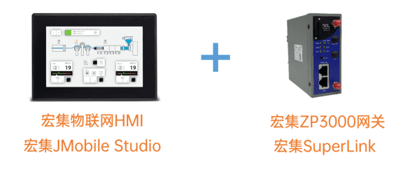 宏集物联网HMI异地远程管理和监控套装主要由四部分组成,分别是宏集物联网 HMI(硬件)、宏集ZP3000网关(硬件)、宏集SuperLink(软件),宏集JMobile Studio组态软件。