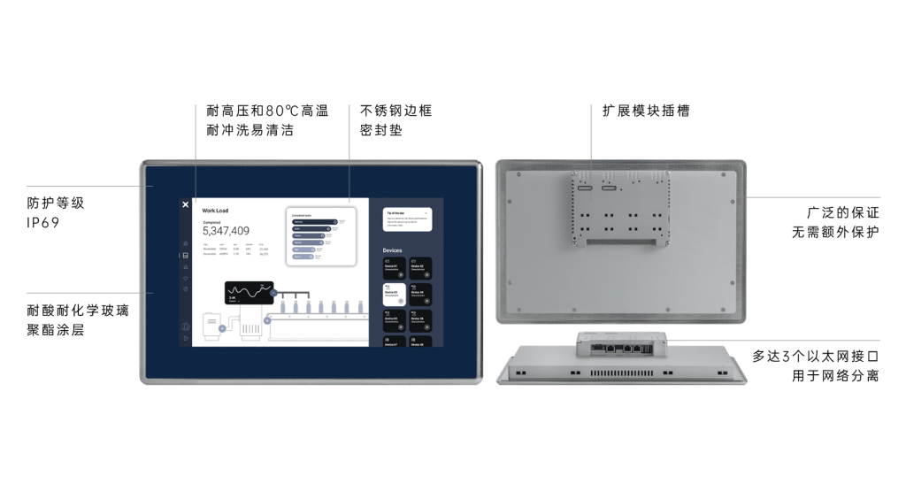 在食品、饮料、制药、化学等行业,生产环境要求设备不仅要可靠,而且要符合严格的卫生标准。 宏集的专业HMI正是为了应对这些挑战而设计的。它采用不锈钢制成,能够抵抗频繁使用清洁剂造成的腐蚀,且不再需要像常见的那样将面板放置在昂贵的机柜内。
