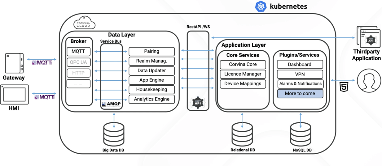 宏集CORVINA一体化数据管理平台基于 Kubernetes。从左侧开始,设备通过宏集JMobile软件使用 MQTT 连接到云。MQTT 代理将数据接收至数据层。这些数据被传递到提供核心服务的应用程序层,包括设备激活和管理、用户管理、仪表板、VPN 和其他插件服务。Rest API 还可用于将 Corvina 连接到第三方服务或应用程序。