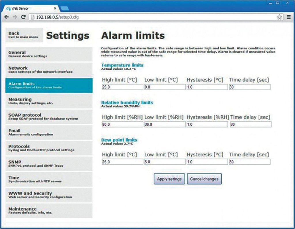可以直接在PC,智能手机或平板电脑的Web浏览器中完成。您所需要做的就是输入传感器的IP地址,打开“设置”,然后设置从通讯到警报电子邮件的所有内容。