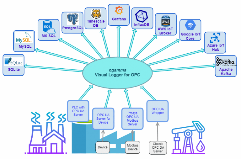 传统OPC通信是基于Windows系统的COM/DCOM技术,无法应用于Linux系统中,存在一定的局限性。此外,在通信前还需要对OPC客户端和服务器进行复杂的DCOM配置,而且通信容易受到其他应用的影响,使得通信不稳定。为了传统OPC存在的问题,OPC基金会开发出新一代OPC技术——OPC UA。随着OPC UA技术的快速发展,越来越多的现场设备支持OPC UA,而且大量的OPC UA数据正在不断产生。为了安全有效地存储、检索和管理OPC UA数据,越来越多的企业采用数据库进行数据存储,进而实现OPC UA数据的高效存储和管理。为此,虹科提供了一种采集OPC UA数据并存储到数据库的解决方案——Ogamma Visual Logger for OPC软件(以下简称OVL),软件整体架构如下图所示。