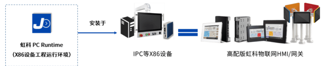 客户现场有西门子、GE、安川等多种品牌的PLC,客户想要将这些PLC数据通过MQTT协议上传到客户自己开发的IOT平台中,进而实现设备状态参数的远程监控。考虑到客户的实际需求,我们推荐客户使用具有虹科物联网HMI/网关功能的软件方案——虹科PC Runtime,该方案与虹科物联网HMI/网关(硬件方案)功能相同,部署在客户的X86设备中,快速赋予原有X86设备物联网HMI/网关功能,实现数据采集和传输。