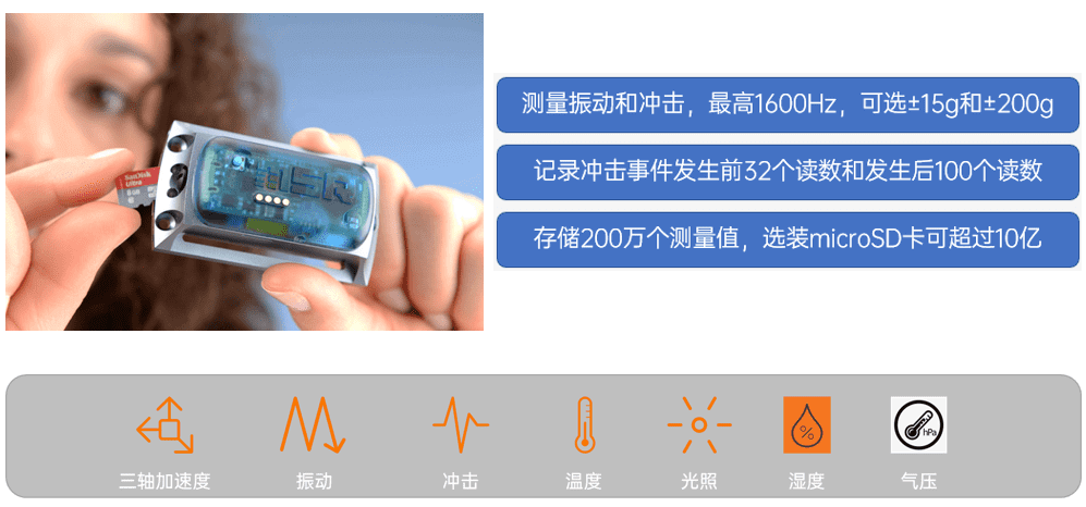 HK-MSR175:选装±15g或±200g的加速度芯片,实现三轴加速度监测,测量频率最高可达6400Hz,适用于精确监测冲击瞬间的加速度。同时支持温度、湿度、光照等环境监测。
