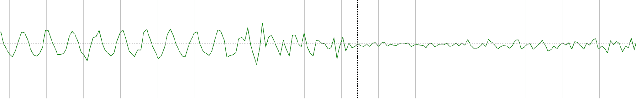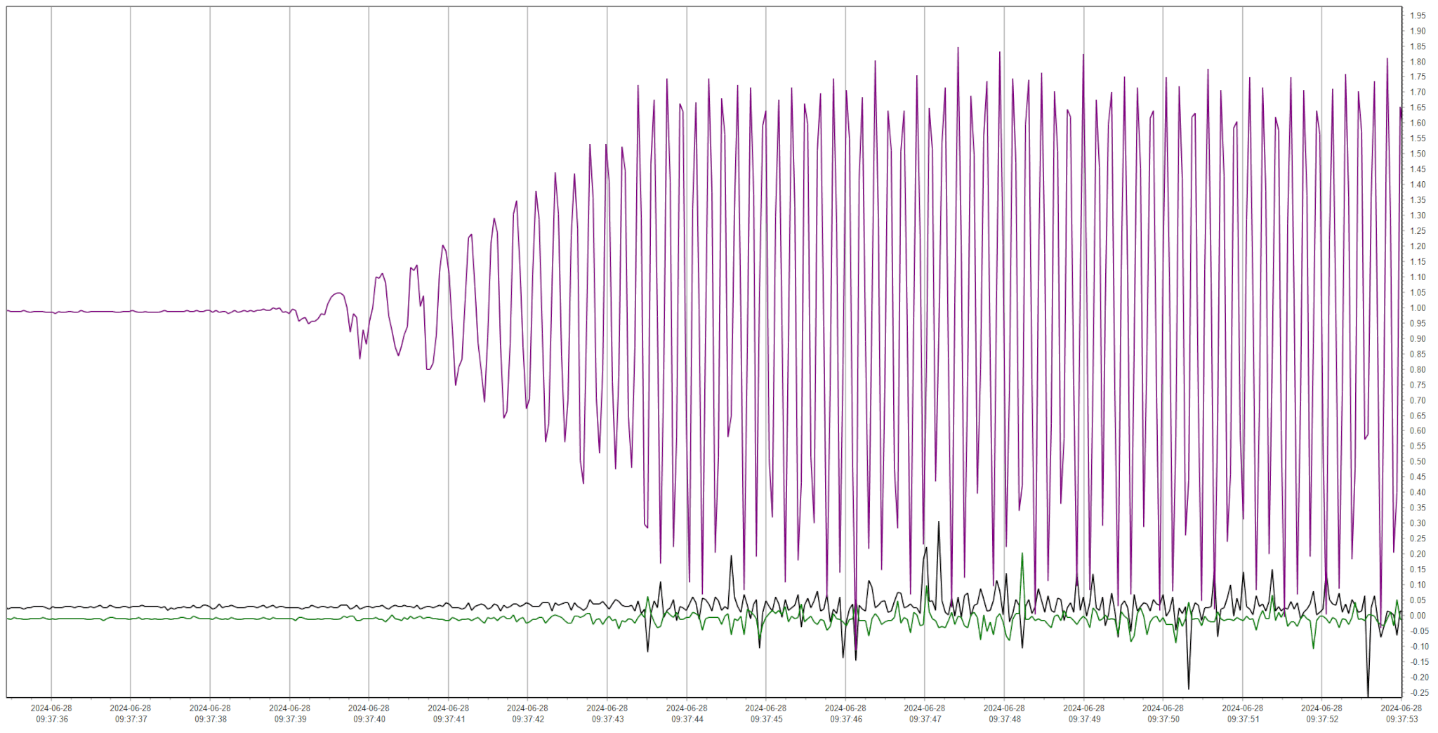 可以看到竖直振动台启动后平台的运动会受迫缓慢加强并达到稳定。而另外两轴的方向上基本没有振动发生。同样地,记录相邻峰峰值间的时间,我们确认振动周期约为175ms,即振动频率为5.7Hz左右。