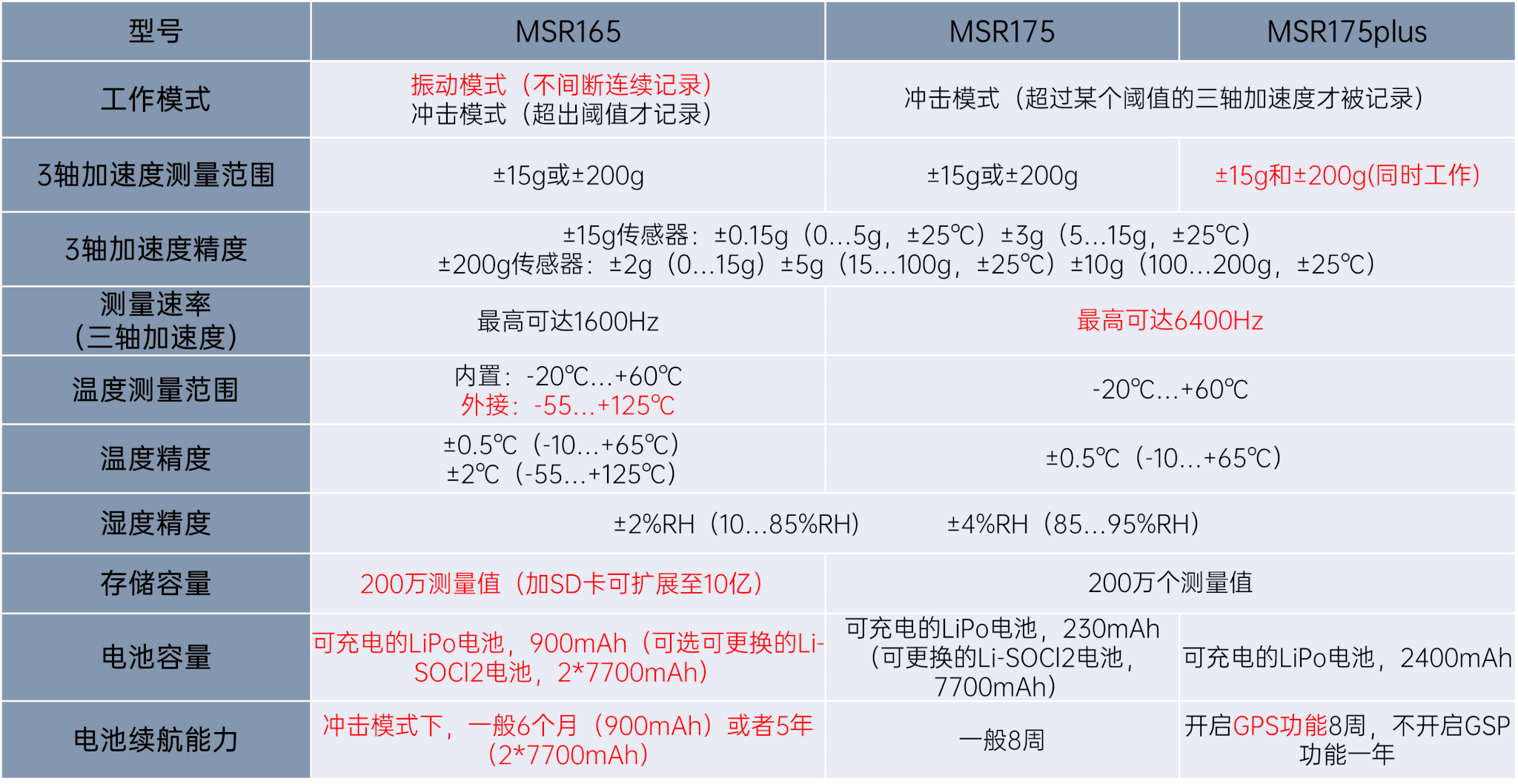 HK-MSR无线物流监测记录仪具有三个型号,分别是HK-MSR165、HK-MSR175以及HK-MSR175plus。每个记录仪具有不同的优势功能: