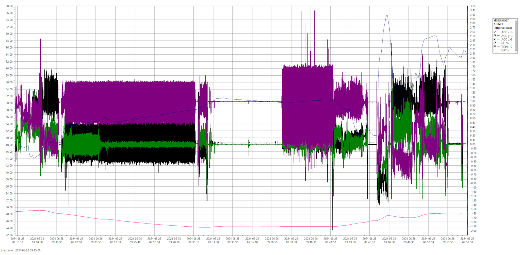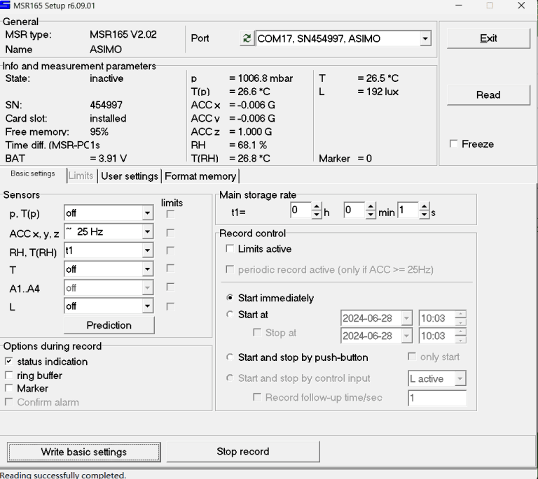 首先,我们写入HK-MSR165的配置文件,其中加速度测量频率为25Hz,温湿度记录周期为1s。随后设定启动时间,进入实验室后开始实机验证。