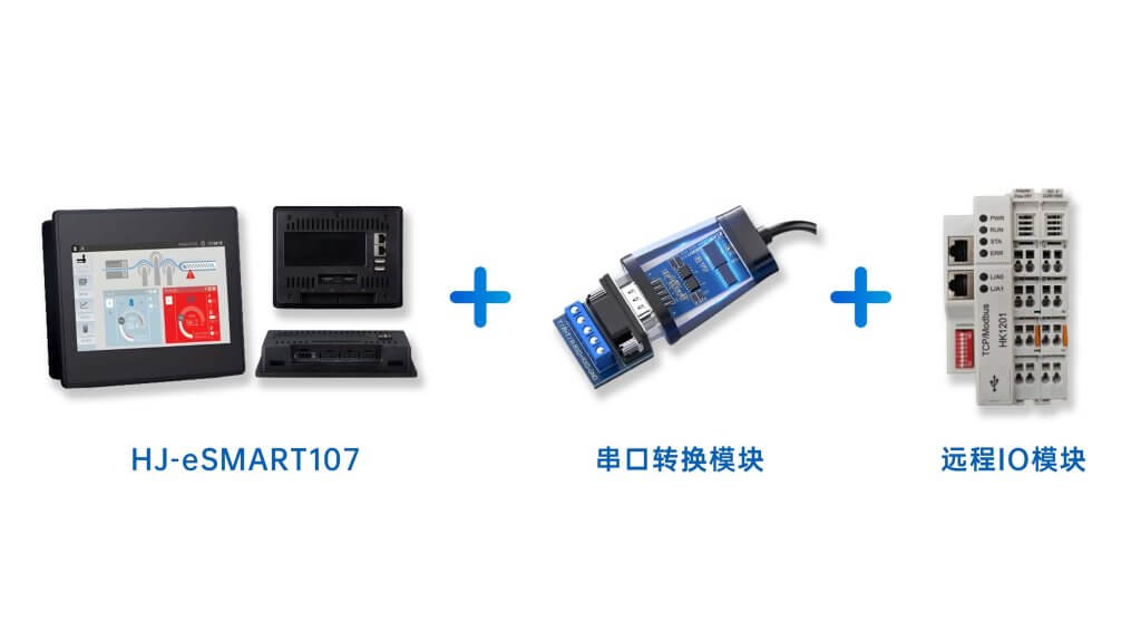 • HJ-eSMART107(带CODESYS V3 Runtime授权)、1个485串口转换模块、1个HJ-1201(Modbus TCP耦合器)、1个HJ-1018(8通道PNP型DI模块)、1个HJ-2018(8通道PNP型DO模块)。