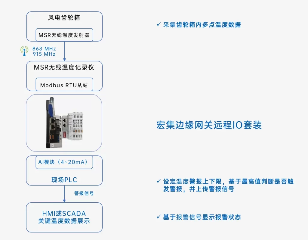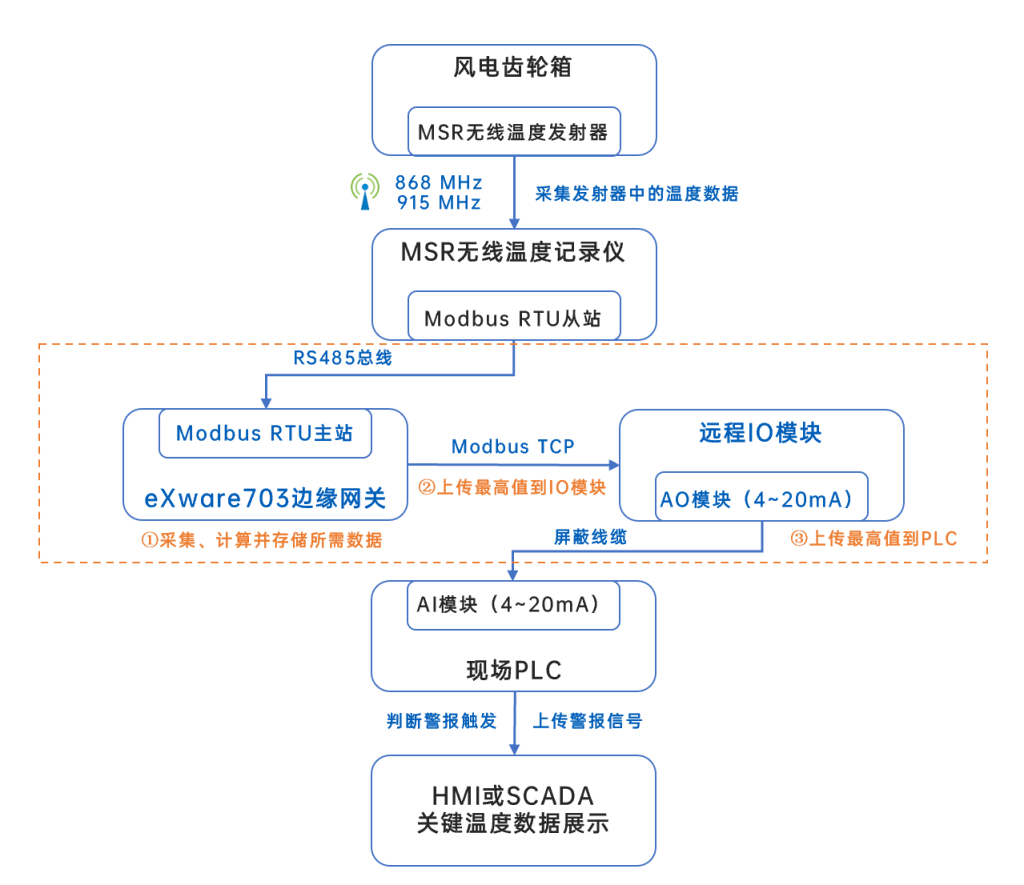 - 通过边缘网关强大的边缘计算能力,计算风电齿轮箱内多点的10分钟均值温度,判断最高温度值并通过远程IO模块将数据传输给现场PLC中,完成齿轮箱温度的警报设定与通知