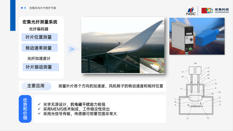 主要应用于测量叶片各个方向的加速度、风机转子的转动速度和相对位置。风能发电时保持低损耗非常重要,因此要尽可能少地产生制动涡流。风力发电时由于存在高电压和高电流,传统的电气传感器无法提供可靠的数据,而宏集光纤测量系统能够在高电压下提供可靠的测量信号。该系统由光纤编码器和光纤加速度计组成,光纤编码器能够在强电磁干扰下提供精确的叶片位置和转动速率信号,光纤加速度计能够测量叶片的振动信号。