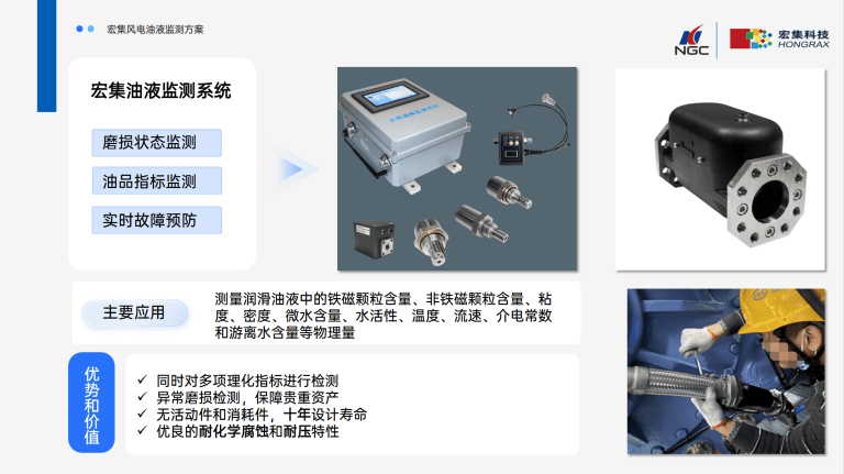 主要应用于测量润滑油液中的铁磁颗粒含量、非铁磁颗粒含量、粘度、密度、微水含量、水活性、温度、流速、介电常数和游离水含量等物理量。宏集油液传感器集成了针对上述物理量的检测组件,同时可选配介电常数及游离水检测组件,从而完成对油液的磨损状态与油品特征一体化检测任务。