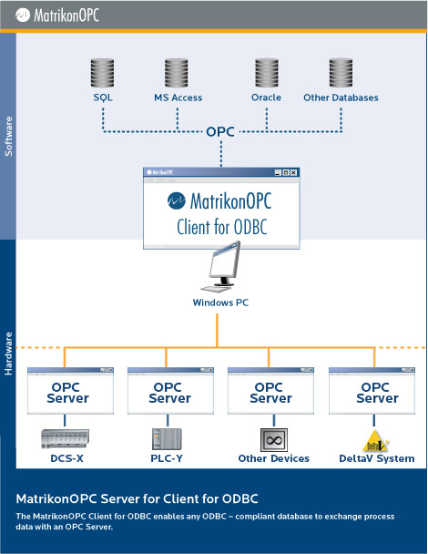 MatrikonOPC ODBC客户端在一侧与数据库进行本地通信,而在另一侧与所有设备进行通信。通过使用事实上的开放式连接标准OPC,此连接器提供了一种简单,易于部署的方法,可将工厂车间数据移动到关系数据库中。