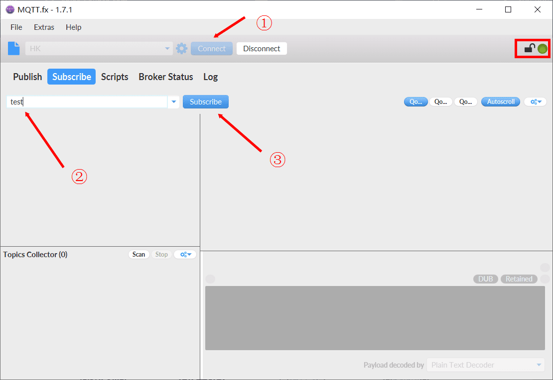 2. 连接MQTT Broker,配置订阅主题(对应MQTT发布端的发布主题)