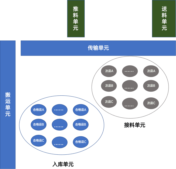 智能化物料分拣系统是将随机的、不同类别、不同去向的物品,按其要求进行分类(按产品类别或产品目的地不同区分)的一种物料搬运系统。控制系统一般硬件平台由供料单元、输送单元、搬运单元、推料单元、转盘接料单元、入库单元等组成。如图所示,待分拣产品分为合格品A、合格品B、合格品C。其中,灰色样块次品A、次品B、次品C为不合格产品,由接料单元接料后进入返工流程 ;入库单元产品为合格产品,根据实际需要分别进入下一步工序处理。