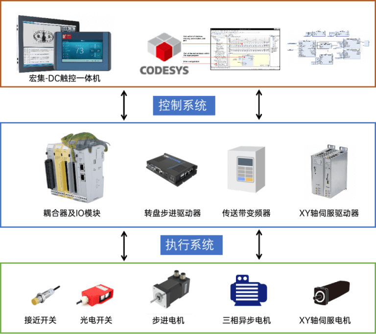 宏集DC系列触控一体机集成了PLC和HMI,自带数字量和模拟量的IO接口,且能够通过耦合器和扩展IO模块与变频器、步进驱动器、伺服驱动器之间进行连接,通过EtherCAT实时以太网总线实现通信,能够有效提升控制系统的稳定。自动分拣控制系统硬件三层架构如图所示。