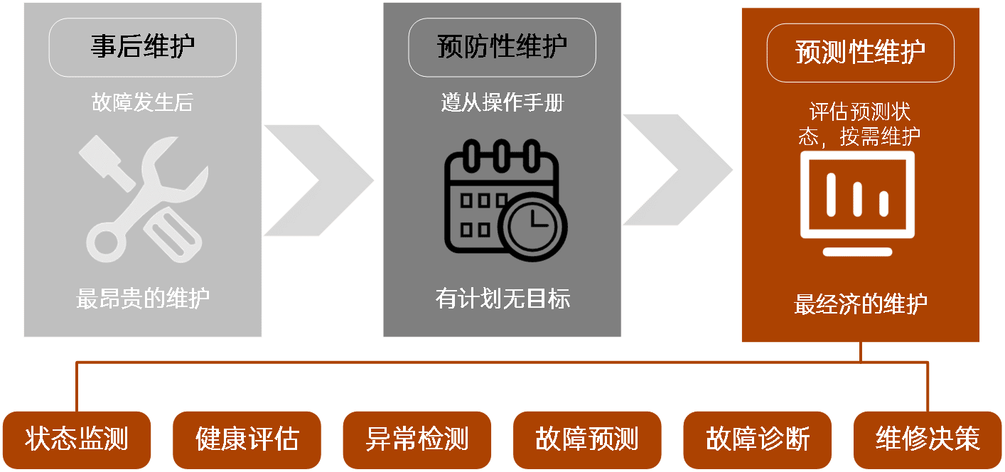 设备维护一般有三种模式:事后维护、预防性维护和预测性维护。事后维护通常是在设备产生故障后采取措施进行维护,是一种成本较大的维护方式。预防性维护属于事先维护,是一种基于时间、性能等条件,对设备进行定期维护,但更多是根据经验进行维护的方式。