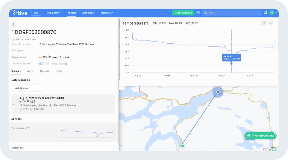 移动APP会立即将所有温度数据上传到Tive云平台,以实现审计跟踪,满足您的合规性需求。使用Tive Tag移动或桌面仪表板查看您的货件的完整历史记录,包括整个冷链的温度偏移。
