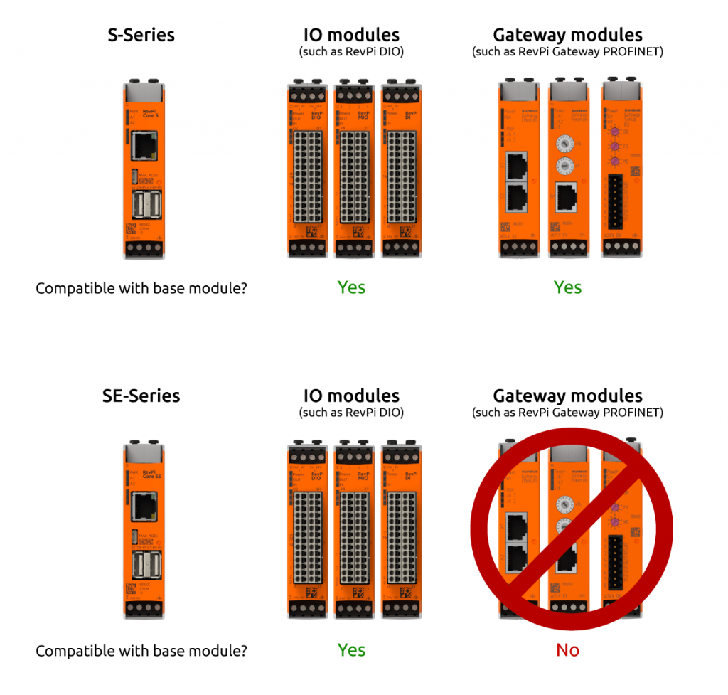 以RevPi Core S/SE基础模块为例,S系列与SE系列的区别