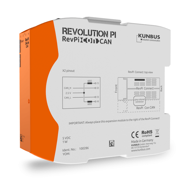 通过使用RevPi Con CAN扩展模块,您可以为RevPi Connect配备CAN总线功能。扩展模块具有一个4针连接器,用于连接CAN总线。