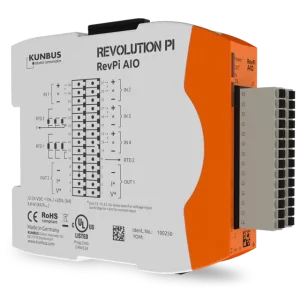 除了三种不同的数字量I/O扩展模块外,还提供了一种模拟量I/O扩展模块。通过使用RevPi AIO模块,工业树莓派可以扩展出4个模拟量输入、2个模拟量输出和2个RTD通道。像所有的I/O模块一样,RevPi AIO模块有一个28针的I/O连接器,输入、输出和RTD通道相互之间和与逻辑电路之间是电隔离的。RevPi AIO模块根据EN 61131-2的要求进行抗干扰保护,可在-30℃至55℃的环境温度下运行。此外,模拟量I/O模块通过了UL认证。