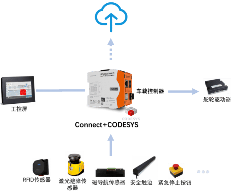 随着AGV(Automated Guided Vehicle)产品和技术的不断发展, 生产工序或产线之间可以通过AGV进行高效连接,提高了自动化水平和生产效率,促进了工业柔性生产线、自动化物流系统的实现。本案例中虹科工业树莓派Connect+CODESYS作为车载控制器,通过传感器获取所有行驶数据,并将数据通过RS485接口发送到虹科工业树莓派,实现对AGV小车的运动控制。