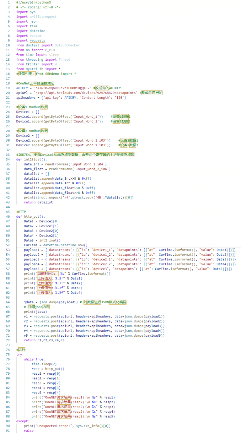 本方案中虹科工业树莓派通过MODBUS TCP协议连接多个底层设备的数据,通过HTTP协议将数据发送至OneNET平台。