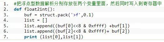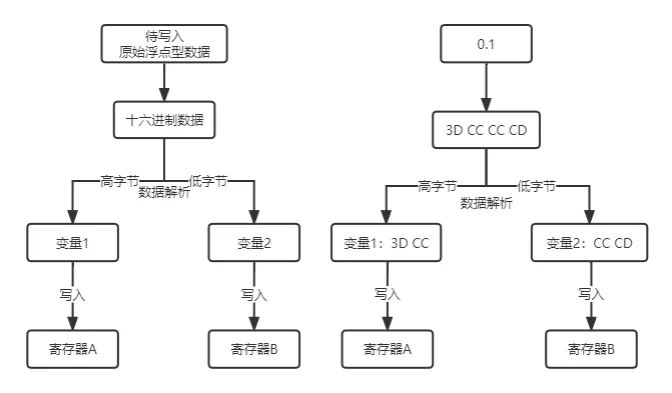 2. 在进行数据写入的时候,要通过数据解析把一个浮点型数据拆分成两个十六进制分别写入到相应的寄存器内(如图2中所示)。