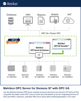 使用我们的西门子OPC服务器解决方案可以使用OPC UA和/或OPC Classic访问来自Siemens S7系列PLC的数据。易于安装,快速且可靠,可用于将西门子S7 PLC与HMI,历史数据访问以及其他支持OPC UA或OPC Classic的应用程序集成在一起。
