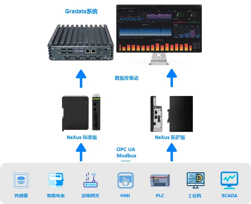 支持 OPC UA 和 Modbus TCP 协议,覆盖市面上 90% 以上的工业设备数据采集与存储