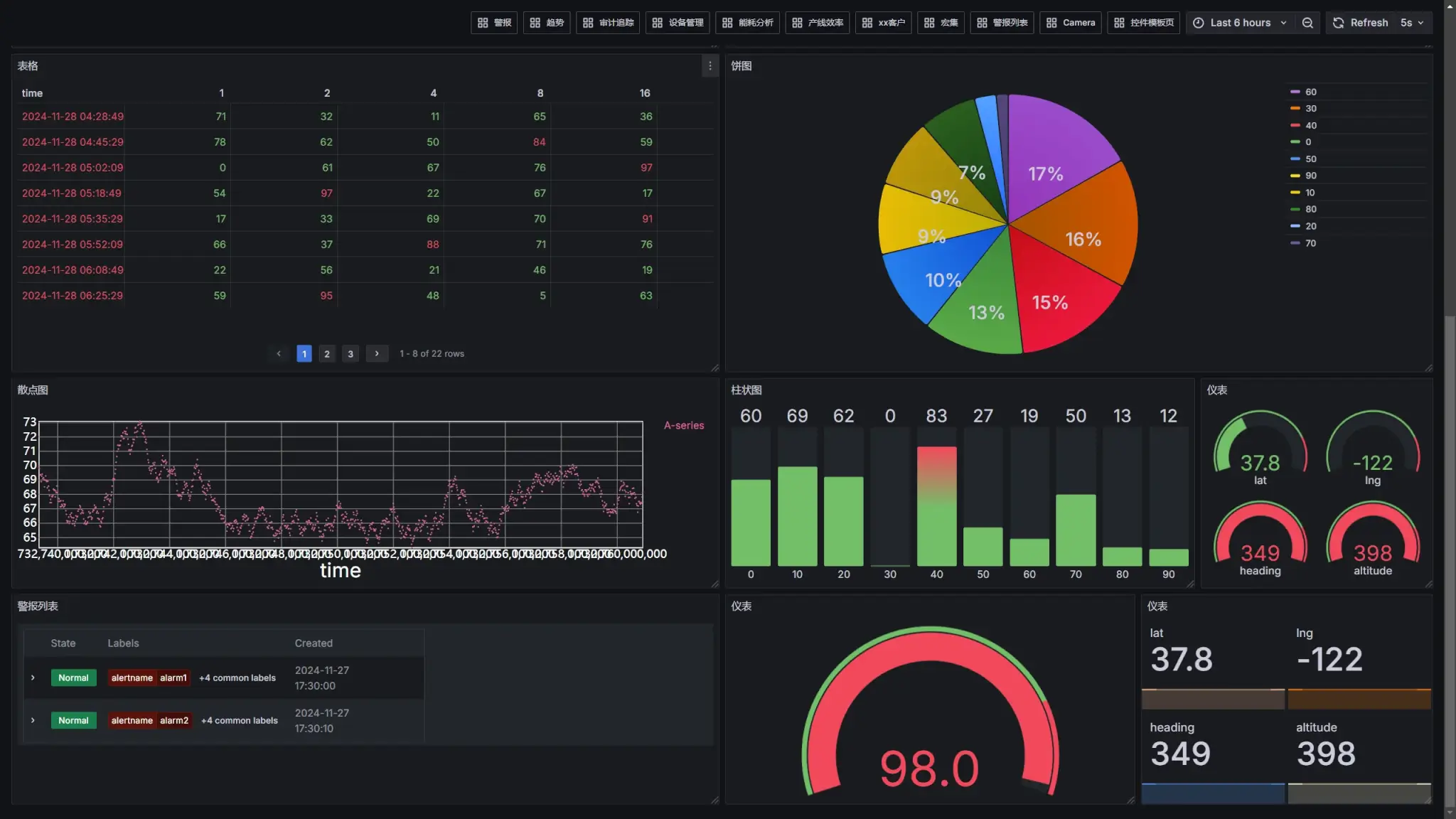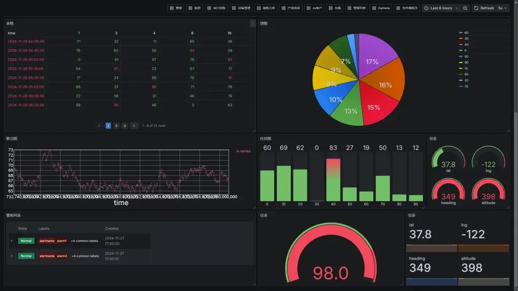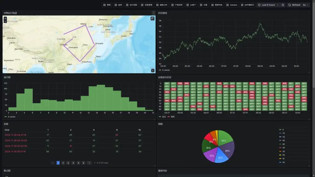 提供丰富控件:曲线、饼图、直方图、柱状图、仪表盘、历史状态图、甘特图、漏斗图、热点图、散点图、多功能表格、地图等,适配各类数据场景,配置简单