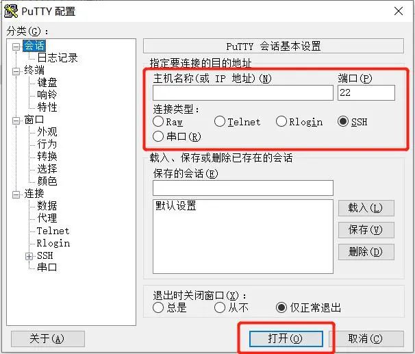 (1)选择SSH模式,填写工业树莓派的IP地址即可,然后点击“打开”;